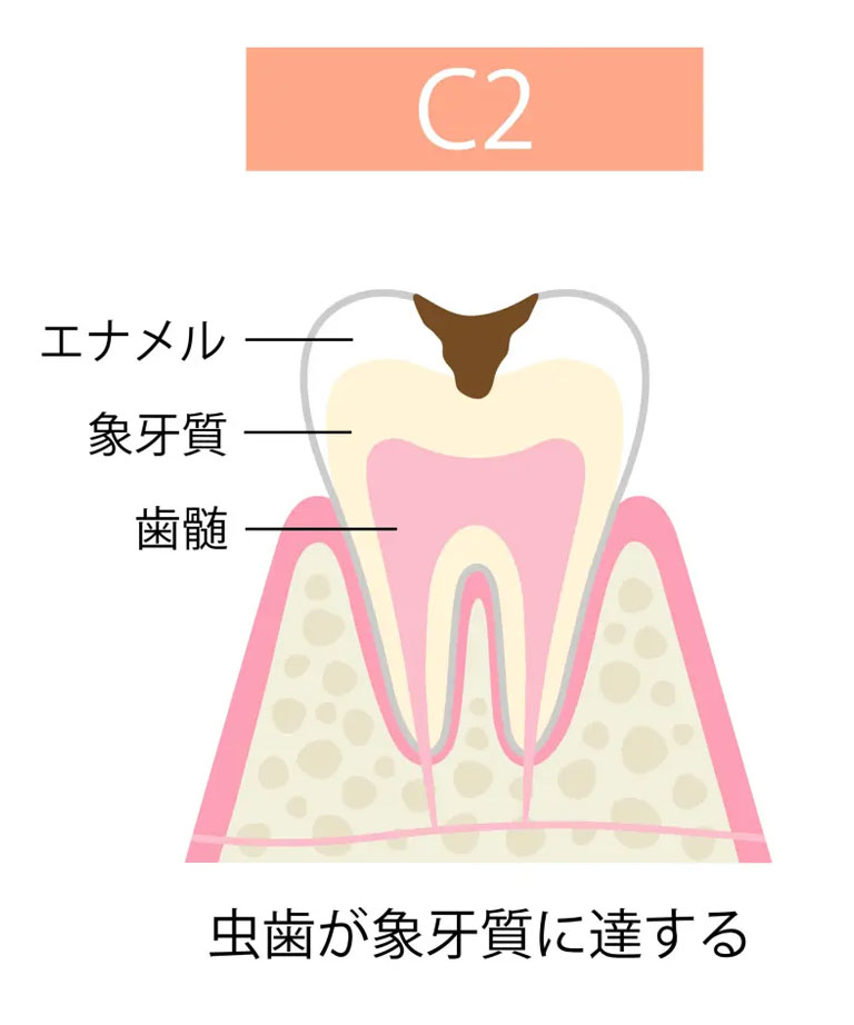 虫歯が象牙質まで達した状態です。象牙質はエナメル質より柔らかいため、虫歯の進行が速くなります。冷たいものや甘いものがしみるようになり、時には痛みを感じることもあります。治療では虫歯を削り取り、詰め物やかぶせ物で修復します。